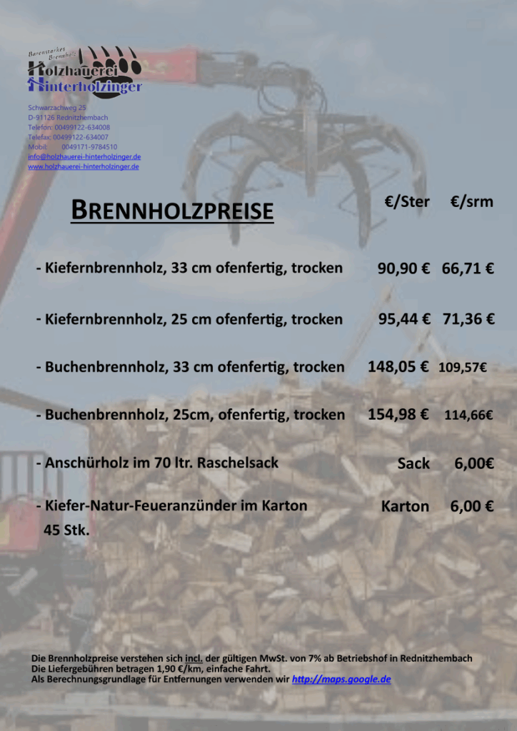 Die Brennholzpreise verstehen sich incl. der gültigen MwSt. ab Betriebshof in Rednitzhembach bei einer Mindestabnahme von 3 Ster oder 4 srm. Scheitlänge ca. 33 cm. Die Liefergebühren müssen wir wegen den sehr hohen Dieselkosten auf 1,90 €/km erhöhen.